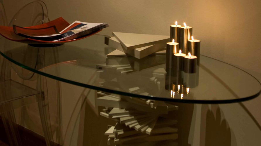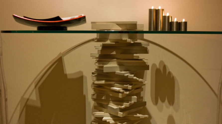 This particular piece of furniture originated from an idea of Stefano Montaperto, who created it to combine heterogeneous elements such as round glass and cement plate corners. During the development process, the inventor combined fibre cement remnants with different thickness by means of a vertical threaded